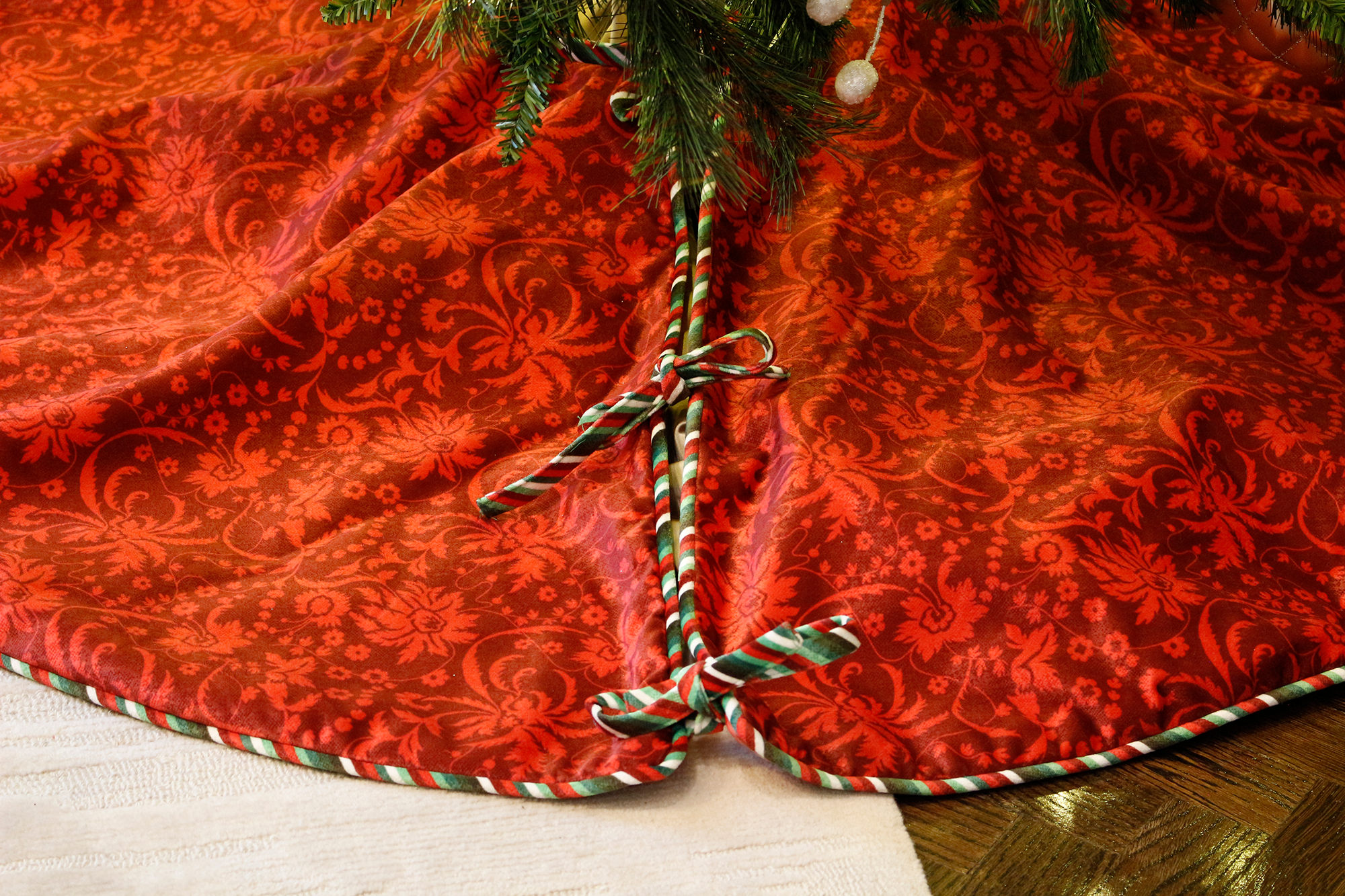 Our reversible Christmas tree skirts feature a luxurious velvet-like texture on both sides and are finished with a refined cording trim, available in a variety of elegant and festive patterns.